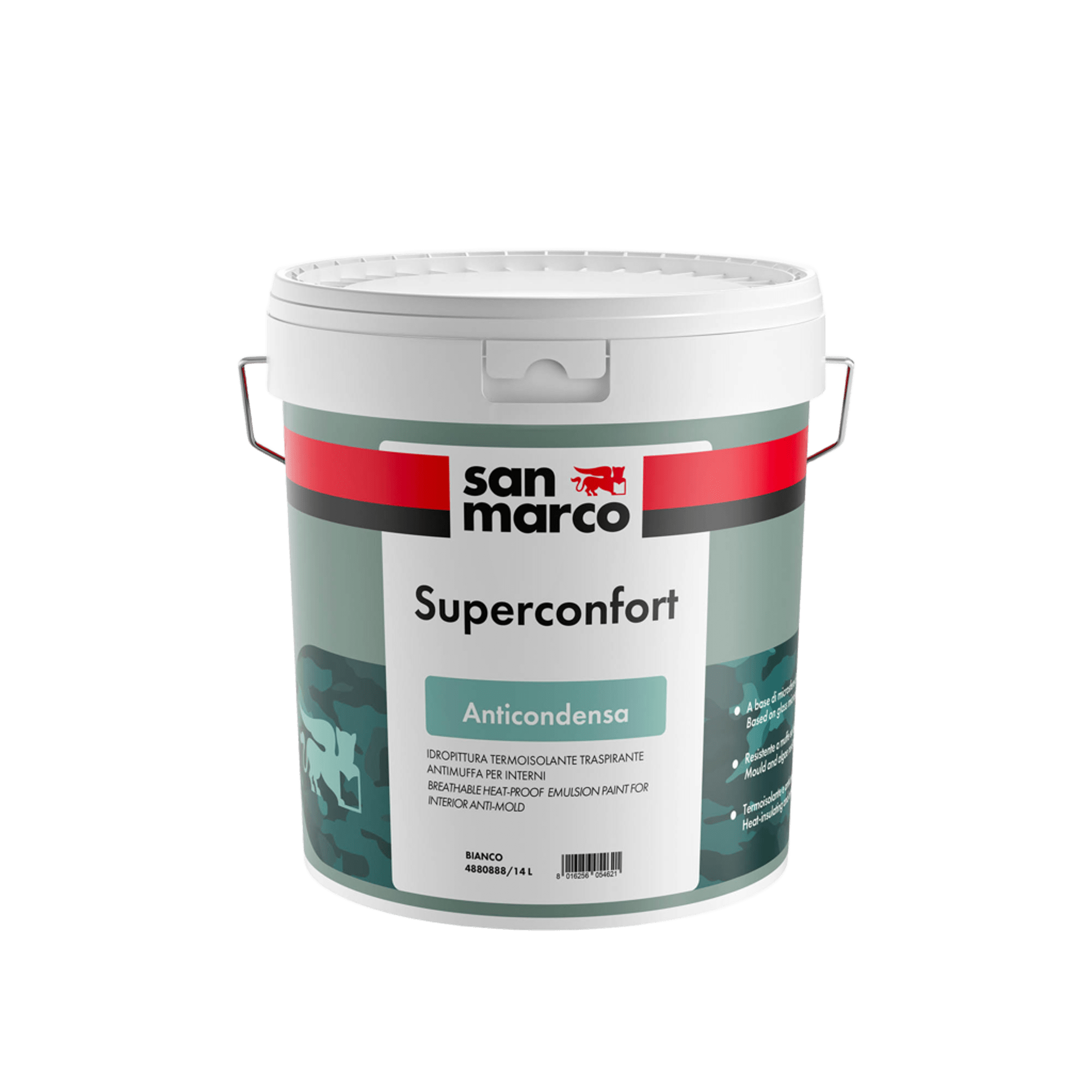 SUPERCONFORT è un’idropittura traspirante per interni termoisolante e antimuffa. Adatta a rifinire e rinnovare tutti gli ambienti, è particolarmente indicata per superfici murali in locali umidi o sottoposti a condensa, quali cucine, bagni, cantine, lavanderie, o nel caso di ponti termici e pareti fredde, come quelle esposte a nord. Si applica su superfici nuove o già dipinte, intonaci civili ma anche pannelli prefabbricati, gesso e cartongesso. La sua particolare formulazione, arricchita con speciali microsfere di vetro cave, mantiene le pareti trattate più “calde”, quindi più asciutte e prive di condensa superficiale. L’eliminazione della condensa, causa principale della formazione della muffa, favorisce il miglioramento del comfort abitativo.