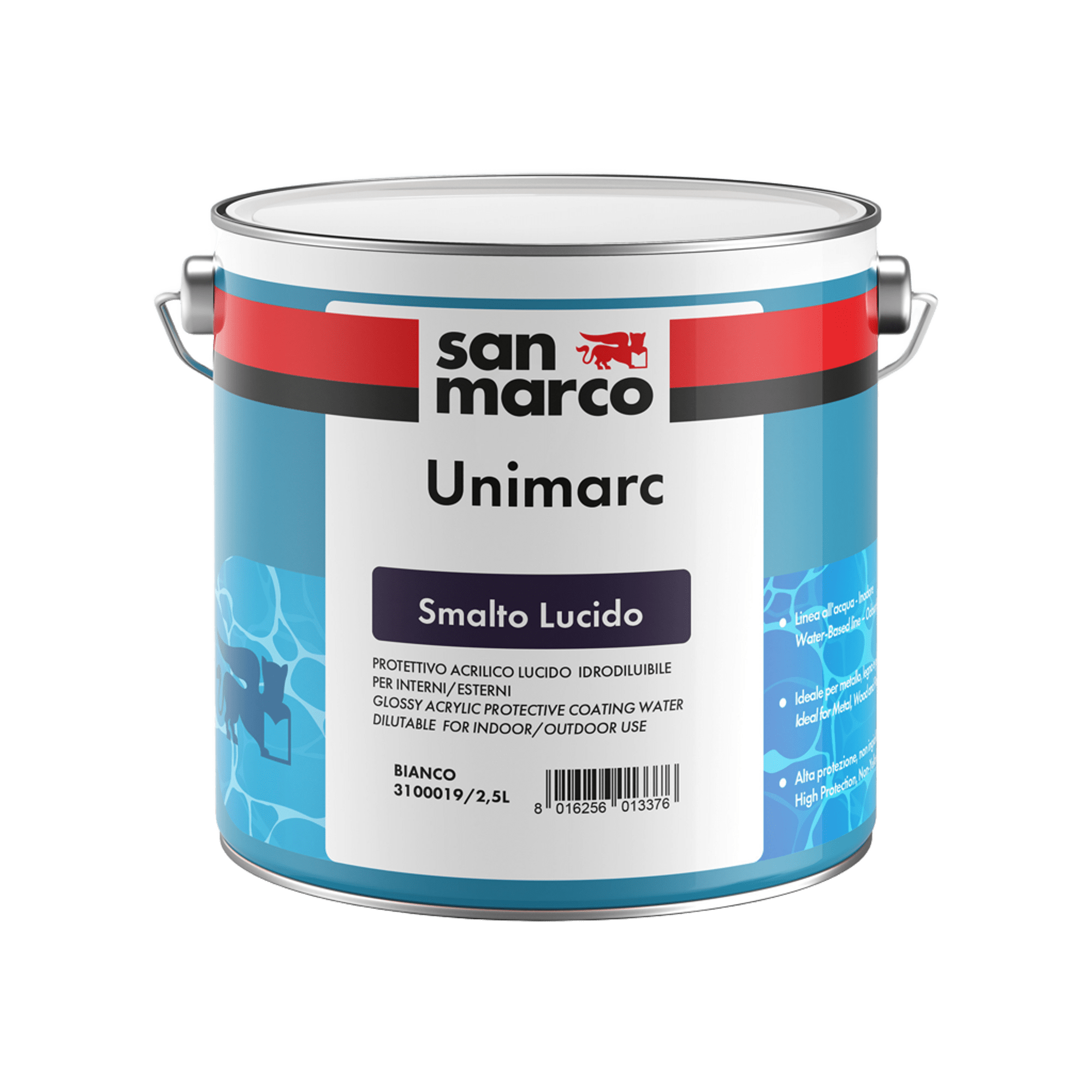 UNIMARC SMALTO LUCIDO è uno smalto all’acqua di elevata qualità a effetto lucido con pigmenti coloranti particolarmente resistenti alla luce. Indicato in modo particolare per la protezione del legno dagli agenti atmosferici, anche in condizioni climatiche severe, e dall’inquinamento. Si può applicare a numerose tipologie di supporto, all’esterno e all’interno: legno nuovo o già verniciato, metalli ferrosi opportunamente pretrattati, superfici zincate, alluminio e leghe leggere, PVC e superfici murali.